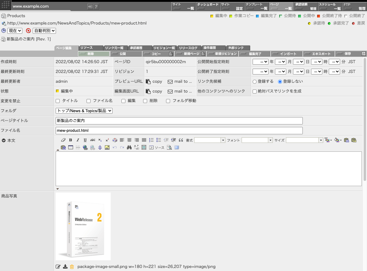 下のスナップショットは、ページ編集画面の例です。ページ編集画面に表示される入力フィールドの多くは、テンプレートの要素定義で決まります。ページ編集画面の構成は、そのページを作成するときに指定したテンプレートにより決まることになります。