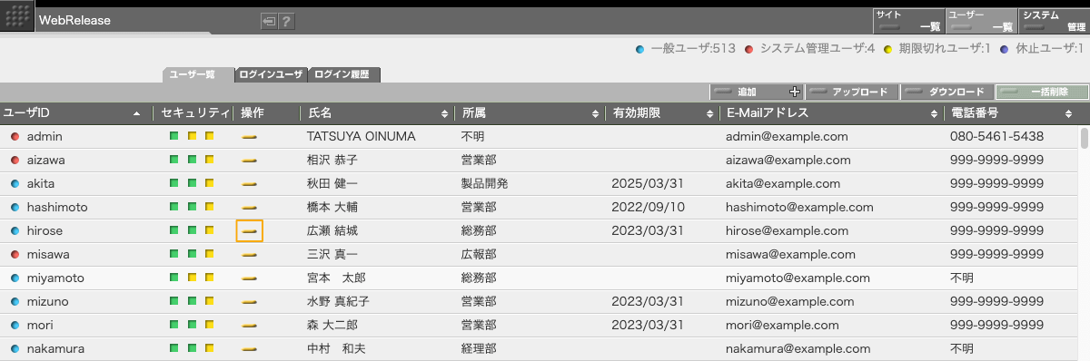 WebRelease を運用するためには、常に最低1人のシステム管理権限をもつユーザが必要です。システム管理権限を持つユーザを全員休止にしてしまうと復旧に手間がかかります。ご注意ください。